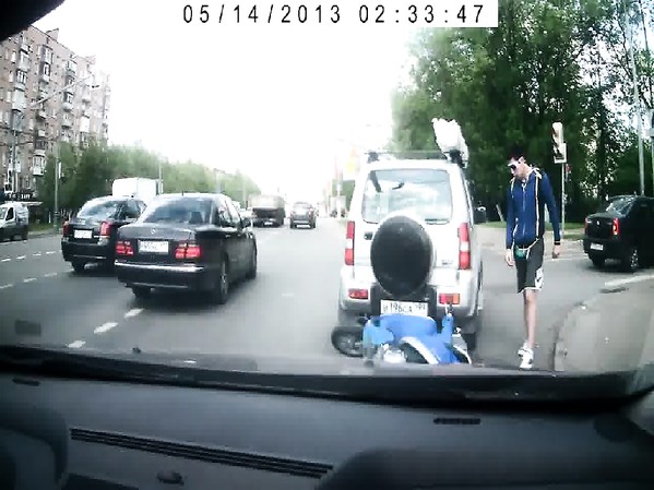 SCOOTERISTE IDIOT PERCUTE UNE VOITURE ET PREND LA FUITE .. EN PERCUTANT UNE NOUVELLE VOITURE