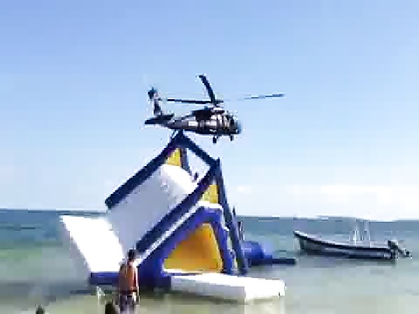 HÉLICOPTÈRE DE POLICE FAIT S'ENVOLER UNE ATTRACTION GONFLABLE SUR LA PLAGE