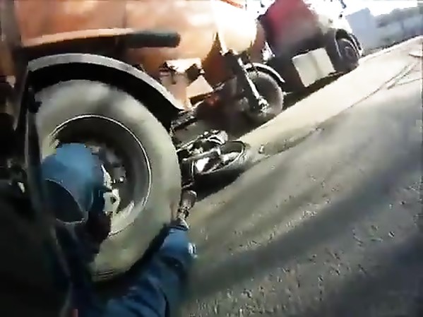 MOTARD GLISSE POUR ÉVITER DE PERCUTER UN CAMION