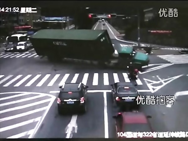 SCOOTÉRISTE PASSE À 2 DOIGTS DE SE FAIRE ÉCRASER PAR UNE REMORQUE DE CAMION