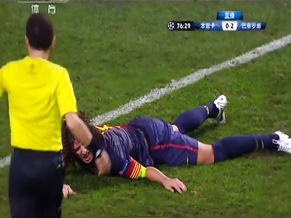 PUYOL SE CASSE LE BRAS LORS DU MATCH LISBONNE / BARCELONE