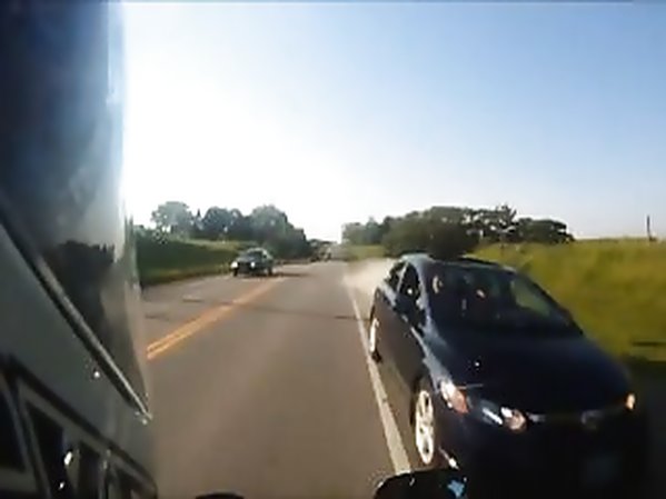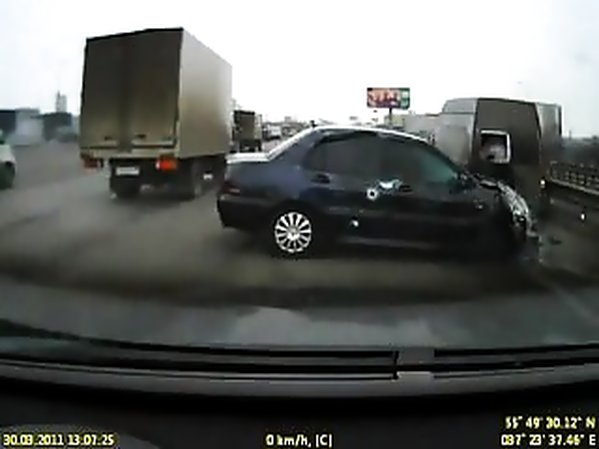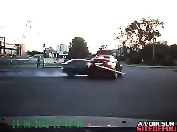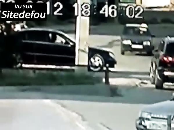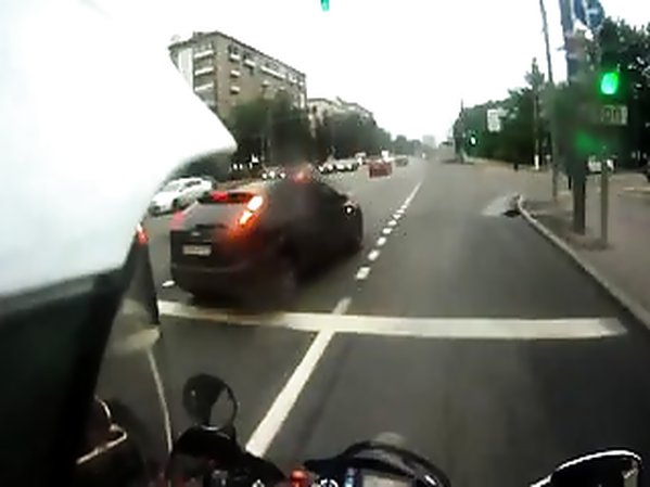 MOTARD RUSSE QUI DOUBLE PAR LA DROITE PERCUTE UN AUTOMOBILISTE QUI LUI COUPE LA ROUTE