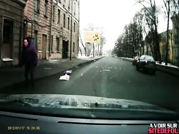 FEMME RUSSE SE FAIT PERCUTER VIOLEMMENT ET SE RELÈVE IMMÉDIATEMENT POUR RAMASSER SES COURSES