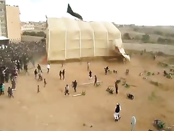 UN CHAPITEAU GÉANT S'ENVOLE EN LIBYE, AVEC DES GENS À L'INTÉRIEUR