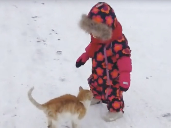 UN CHAT SUIT UNE FILLETTE QUI MARCHE DANS LA NEIGE