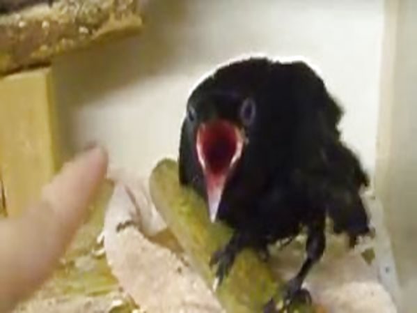 UN BÉBÉ CORNEILLE OUVRE GRAND LE BEC QUAND IL VOIT UN DOIGT S'APPROCHER