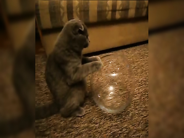 UN CHAT EST FORTEMENT INTRIGUÉ PAR UN AQUARIUM ROND