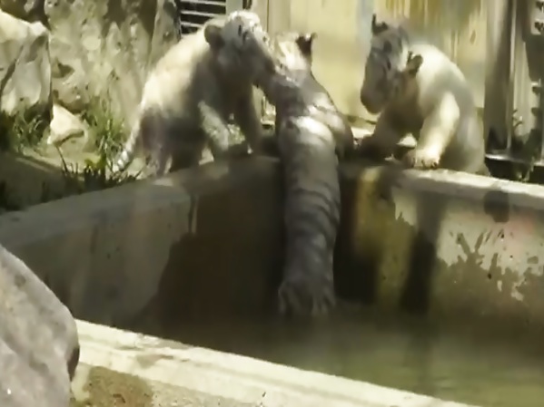 UN TOURISTE A FILMÉ UN BÉBÉ TIGRE BLANC SE DÉMENER POUR SORTIR SON FRÈRE COINCÉ DANS UN BASSIN