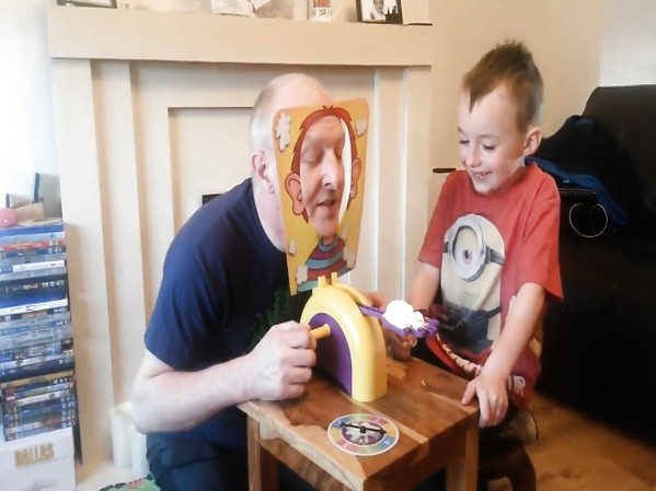 UN HOMME ET UN ENFANT JOUENT AU JEU DE SOCIÉTÉ « PIE FACE ! »
