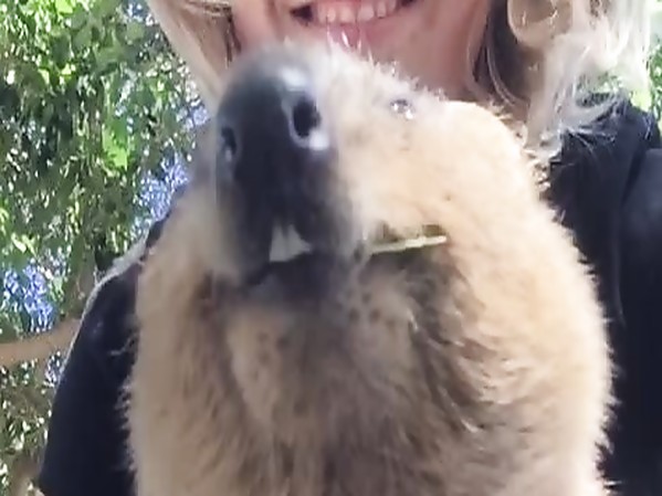 UNE FEMME SE PREND EN SELFIE AVEC UN QUOKKA QUI MANGE