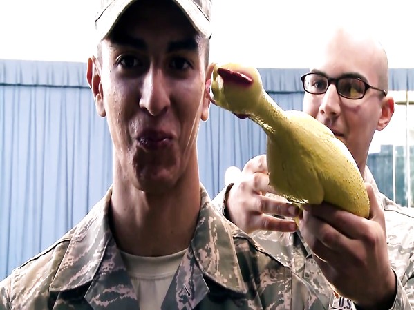 DES MILITAIRES DOIVENT GARDER LEUR SÉRIEUX LORSQU'UN POULET EN CAOUTCHOUC EST PLACÉ PRÈS DE LEUR VISAGE