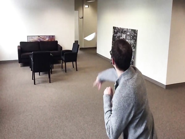 UN HOMME EST VISIBLEMENT TRÈS CONTENT DU LANCER DE SON AVION EN PAPIER