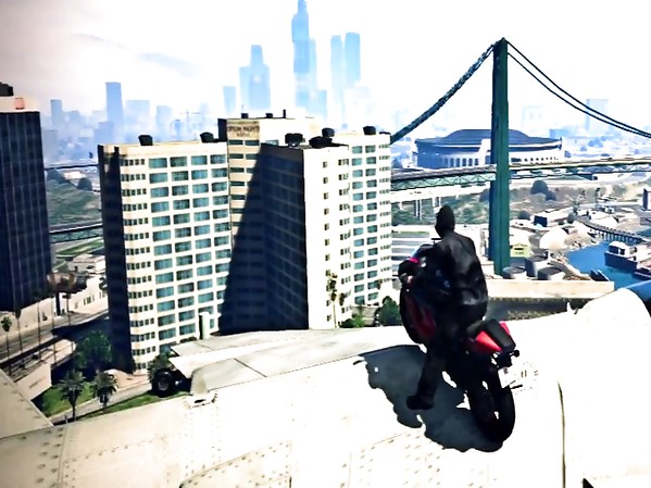 UN JOUEUR RÉALISE UNE CASCADE SPECTACULAIRE À MOTO AU COURS D'UNE PARTIE DU JEU VIDÉO GTA V