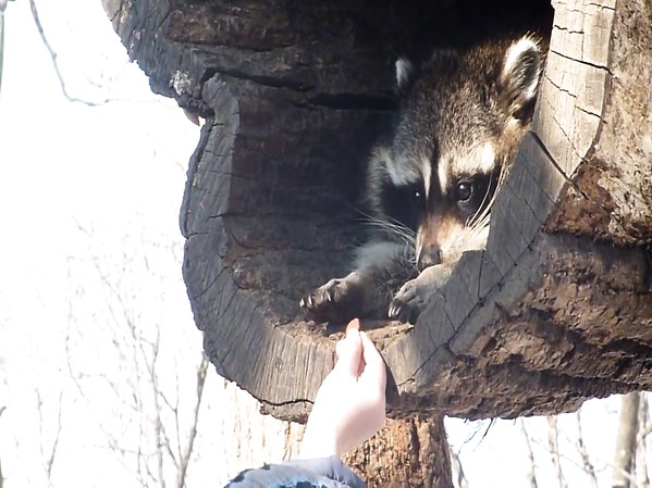 DANS UN TRONC D'ARBRE, UN RATON LAVEUR PRUDENT SORT DOUCEMENT SES PATTES POUR ATTRAPER LA FRIANDISE D'UN TOURISTE (CUTE)