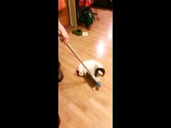 UN HOMME JOUE AU CURLING EN FAISANT GLISSER SON CHAT À L'AIDE D'UN BALAI SUR SON PARQUET