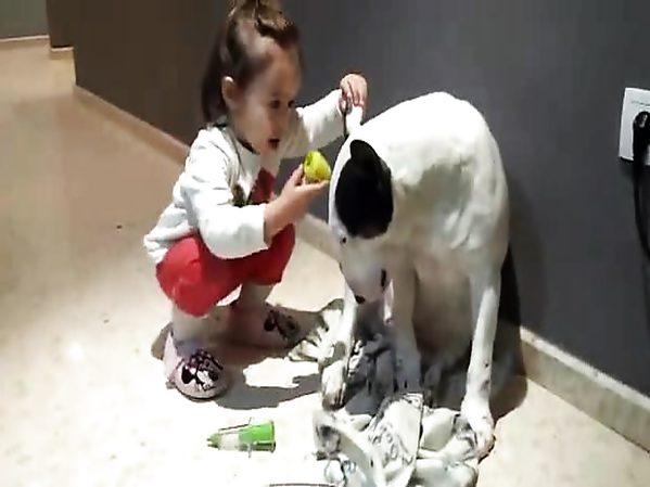 UNE ADORABLE PETITE FILLE PRÉNOMMÉE NOA JOUE À LA VÉTÉRINAIRE AVEC UN CHIEN