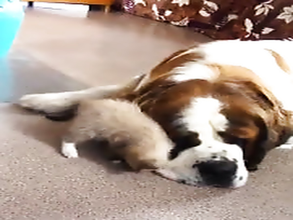 UN PETIT CHATON S'AMUSE À EMBÊTER UN GROS ET PATIENT SAINT-BERNARD