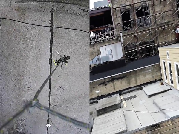 ALORS QU'IL EST AVEC DES AMIS SUR LE TOIT D'UN IMMEUBLE À SAN FRANCISCO, UN GARS UTILISE UN DRONE DJI PHANTOM POUR RÉCUPÉRER UN HÉLICOPTÈRE RADIOCOMMANDÉ QUI EST BLOQUÉ SUR LE TOIT