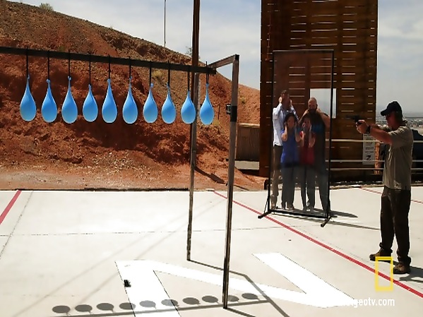 TIM SHAW DE LA CHAÎNE NATIONAL GEOGRAPHIC A RÉALISÉ UNE EXPÉRIENCE POUR SAVOIR COMBIEN DE BALLONS DE BAUDRUCHE REMPLIS D’EAU IL FALLAIT POUR ARRÊTER UNE BALLE