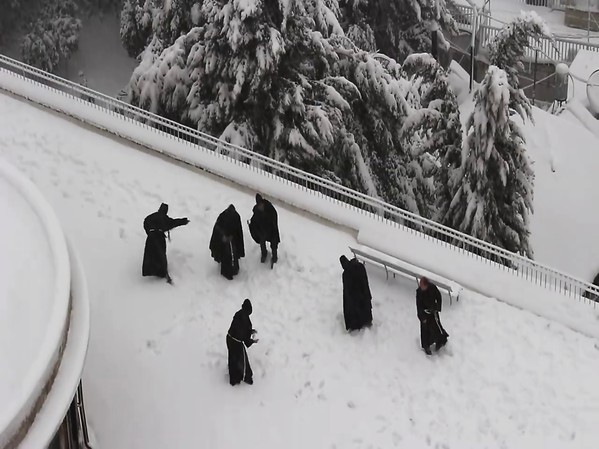 APRÈS DES CHUTES DE NEIGE À JÉRUSALEM, DES MOINES FRANCISCAINS EN ONT PROFITÉ POUR FAIRE BATAILLE DE BOULES DE NEIGE
