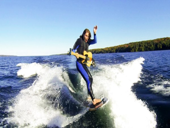 UN HOMME JOUE DE LA GUITARE SUR UNE PLANCHE DE WAKESURF