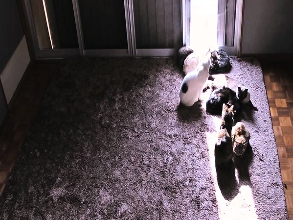 UN TIMELAPSE AU COURS DUQUEL UN GROUPE DE CHATS SE DÉPLACE DANS UNE PIÈCE POUR RESTER ALLONGÉ DANS LA CHALEUR D'UN RAYON DE SOLEIL