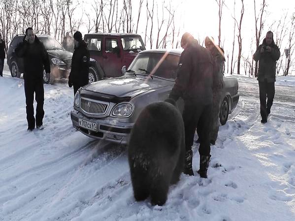 UN RUSSE SE PROMÈNE AVEC SON OURS DE COMPAGNIE ET ATTIRE DES AUTOMOBILISTES CURIEUX