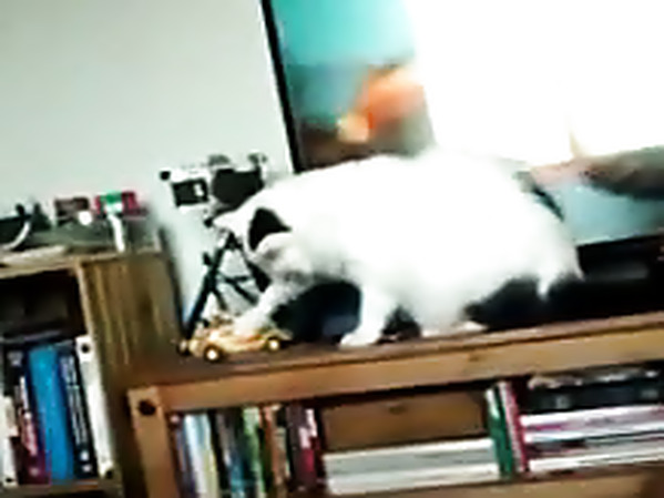 CE CHAT AIMERAIT BIEN FAIRE TOMBER UNE PETITE VOITURE QUI EST POSÉE SUR UN MEUBLE, MAIS SA MAÎTRESSE LUI ORDONNE DE NE PAS LE FAIRE