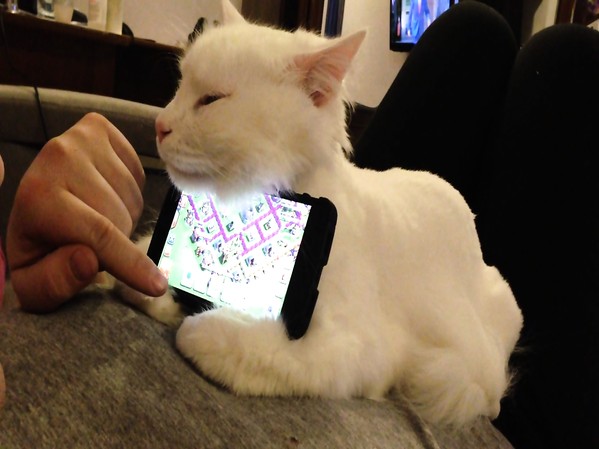 UN HOMME UTILISE SON CHAT COMME SUPPORT DE TÉLÉPHONE PORTABLE