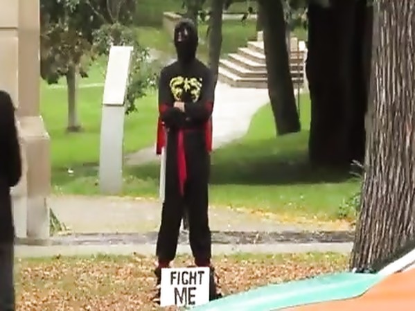 DANS UNE RUE DE TORONTO, UN HOMME DÉGUISÉ EN NINJA AVEC UN PANNEAU "FIGHT ME" ET UNE ÉPÉE EN MOUSSE À SES PIEDS, INVITE LES PASSANTS À SE BATTRE CONTRE LUI