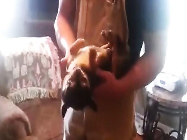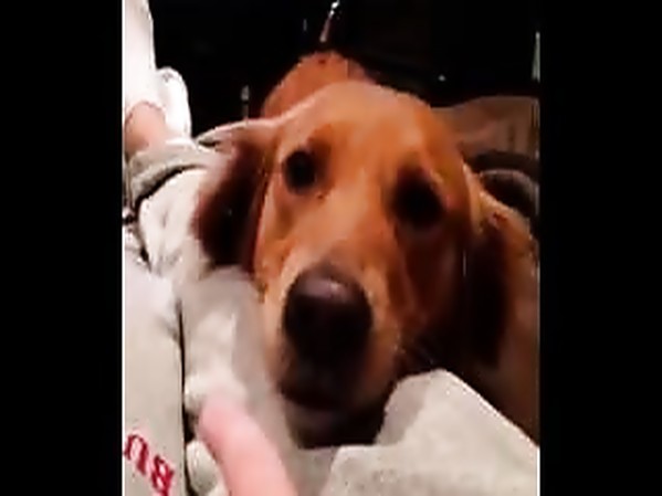 MAYA GROGNE, LA TÊTE POSÉE SUR LES JAMBES DE SON MAÎTRE, EN RÉALISANT DES NOTES DE MUSIQUE