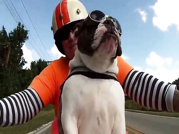 CHRISTINE SUTTON FAIT DE LA MOTO AVEC SA CHIENNE, UN BULLDOG ANGLAIS