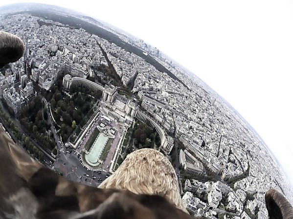 PYGARGUE À QUEUE BLANCHE, ÉQUIPÉ D'UNE CAMÉRA SONY ACTION CAM MINI FIXÉE SUR SON DOS, NOUS OFFRE UNE VUE EXCEPTIONNELLE DE PARIS EN S'ÉLANÇANT DEPUIS LA TOUR EIFFEL