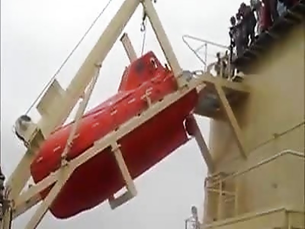 SUR UN NAVIRE CHINOIS, DES MARINS EFFECTUENT LE LANCEMENT D'UNE EMBARCATION DE SAUVETAGE À CHUTE LIBRE