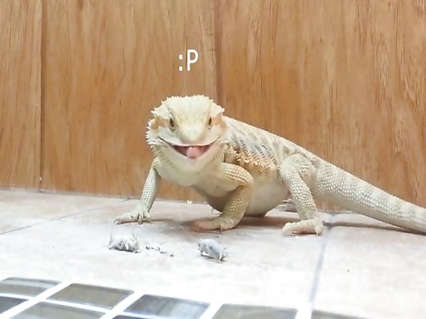A L'HEURE DU REPAS, UN HOMME SERT DES CRIQUETS À SON POGONA CALCIFER