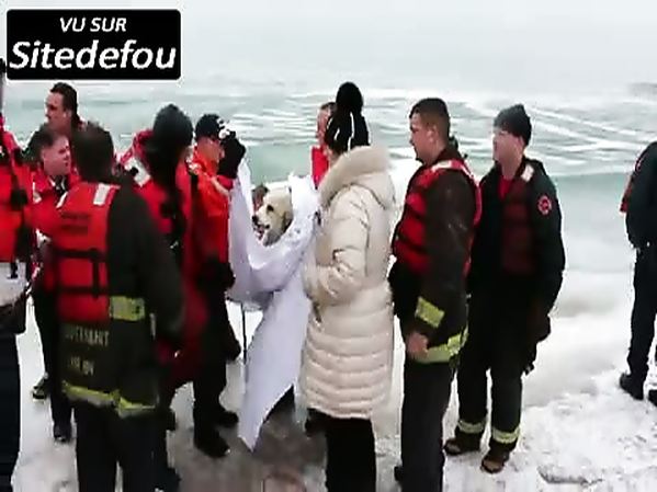 CHIEN SAUVÉ D'UN LAC GLACÉ DANS LE MICHIGAN