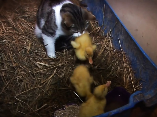 UNE CHATTE PREND 3 CANETONS POUR SES PETITS