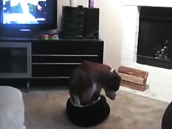UN GROS CHIEN CHERCHE À RENTRER DANS UN PETIT PANIER