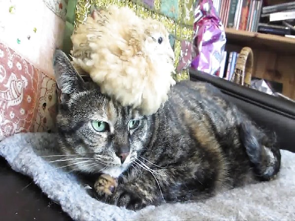 CHAT PAS VRAIMENT CONTENT D'AVOIR UN POUSSIN SUR LA TÊTE