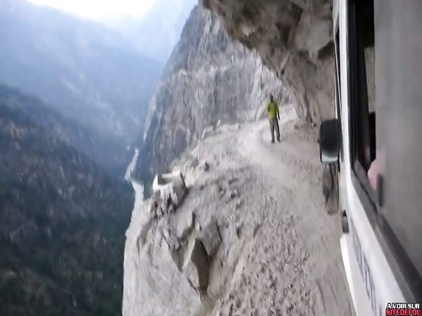 GROUPE D'ALPINISTES SE DÉPLACENT AU BORD D'UNE "ROUTE DE LA MORT" DANS LA RÉGION DE KISHTWAR EN INDE