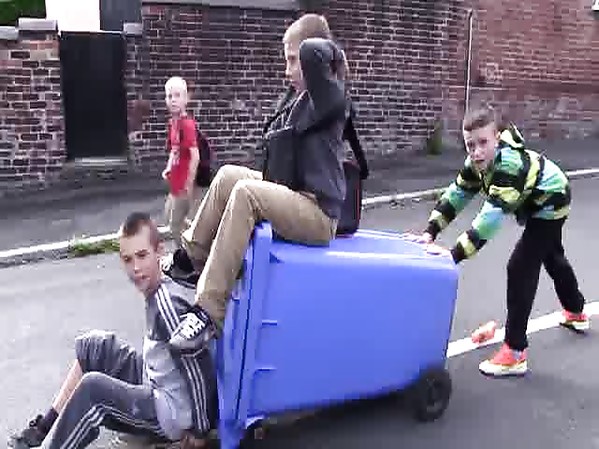 DES ENFANTS ANGLAIS DÉVALENT UNE RUE À BORD D'UNE POUBELLE