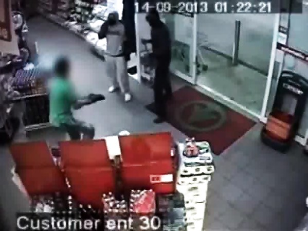 COMMERÇANT FAIT FUIR UN VOLEUR ARMÉ D'UN COUTEAU .. À L'AIDE D'UNE CHAUSSURE (MANCHESTER - ANGLETERRE)