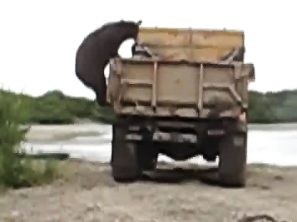 OURS BRUN MONTE SUR UN CAMION POUR VOLER DU POISSON