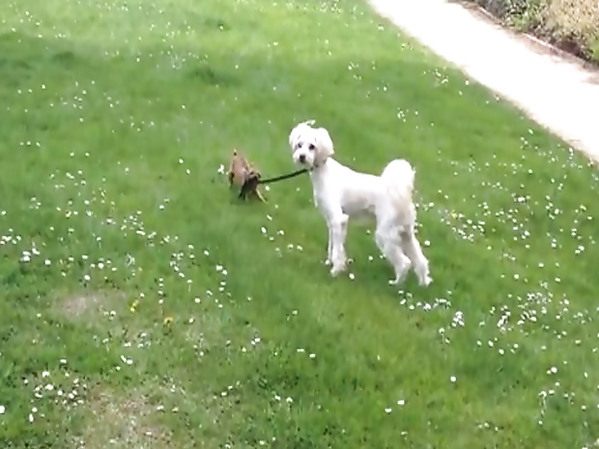 UN GRAND CHIEN SE FAIT "PROMENER" PAR UN PLUS PETIT