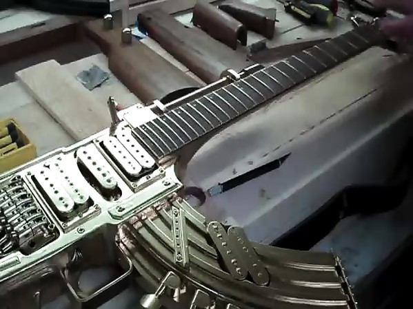 A L'AIDE D'UNE GUITARE ÉLECTRIQUE, IL EN RECRÉE UNE EN FORME DE AK-47