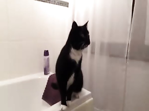 CHAT INTRIGUÉ PAR UN AUTRE QUI OSE S'INCRUSTER DANS SA SALLE DE BAIN