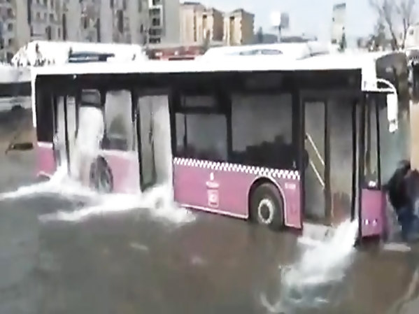 UN AUTOBUS REMPLI D'EAU PAR UNE BOUCHE D'INCENDIE SUITE À UN ACCIDENT (TURQUIE)