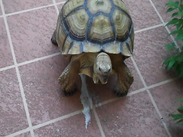 UNE TORTUE PREND SON PIED SUR LA TERRASSE