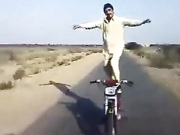 UN PAKISTANAIS DEBOUT SUR SA MOTO, TIRE AU PISTOLET