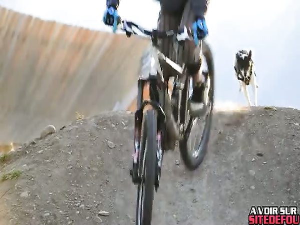 UN CHIEN QUI SUIT SON MAITRE À LA TRACE SUR UN PARCOURS DE VTT